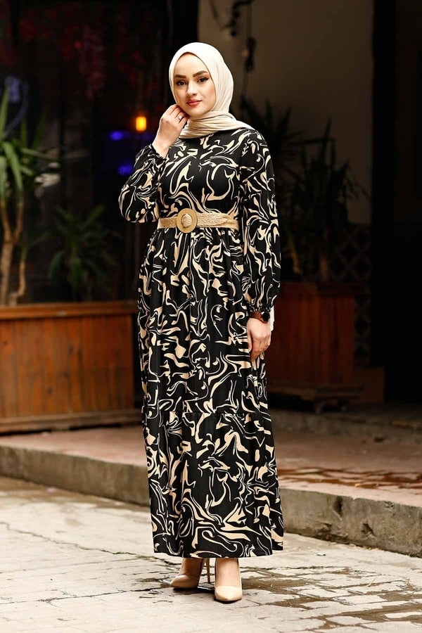 Straw Belt Wave Pattern Muslim Dress Women Luxury Kaftan